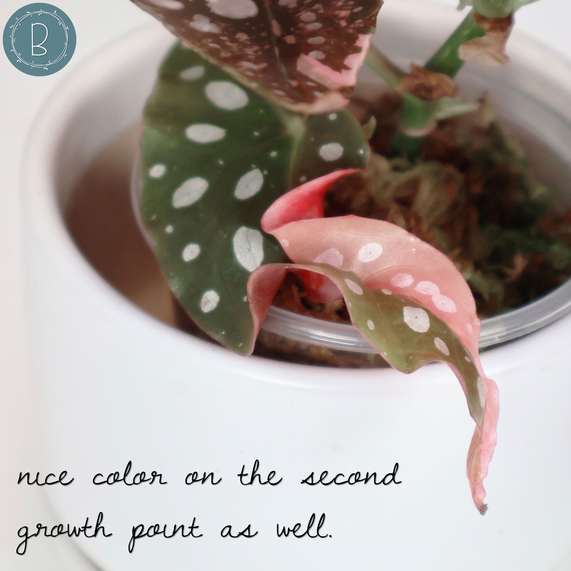 Una hermosa y única Begonia Maculata que presenta una variedad rosada (ya sea sectorial o jaspeada) sobre hojas de color verde oscuro con lunares.