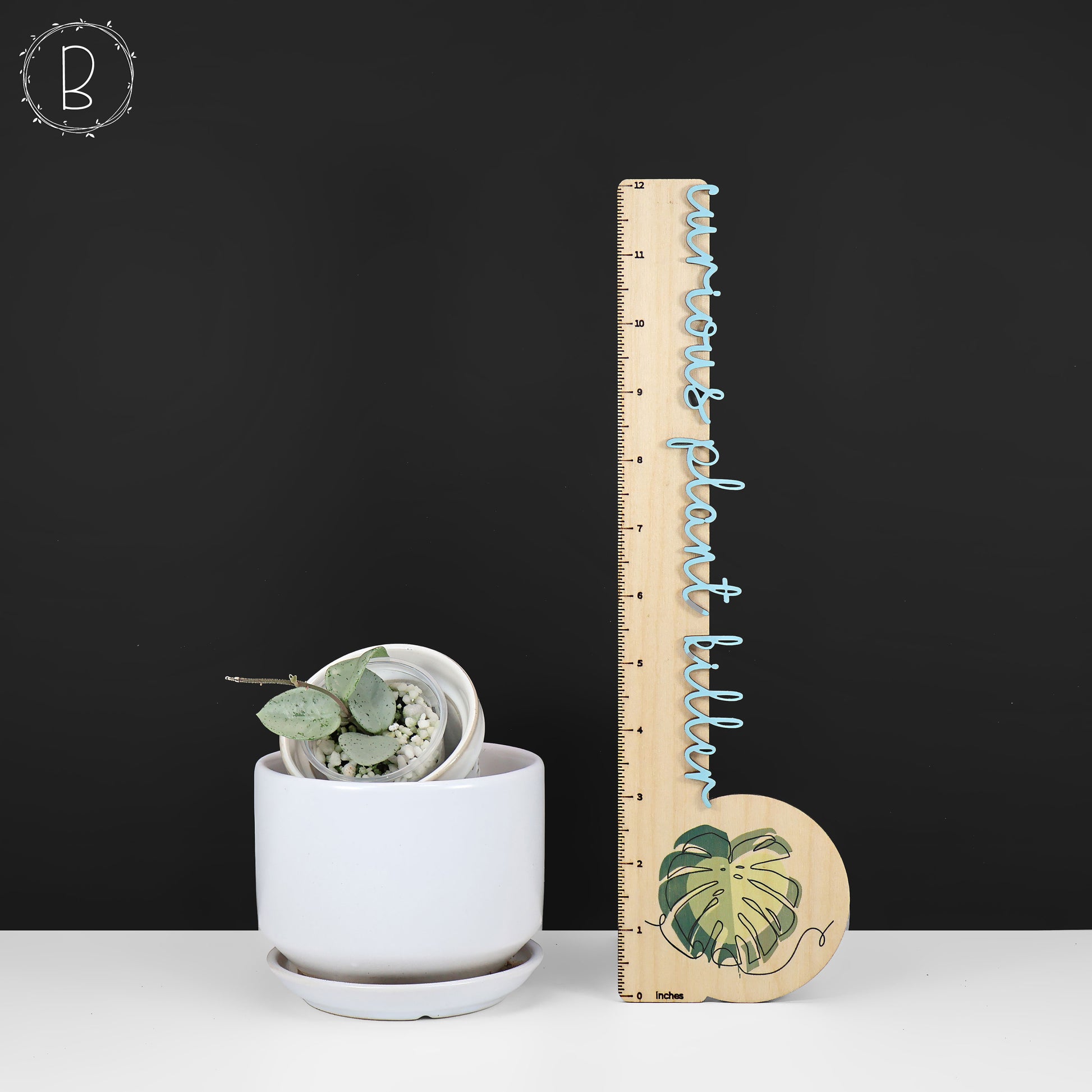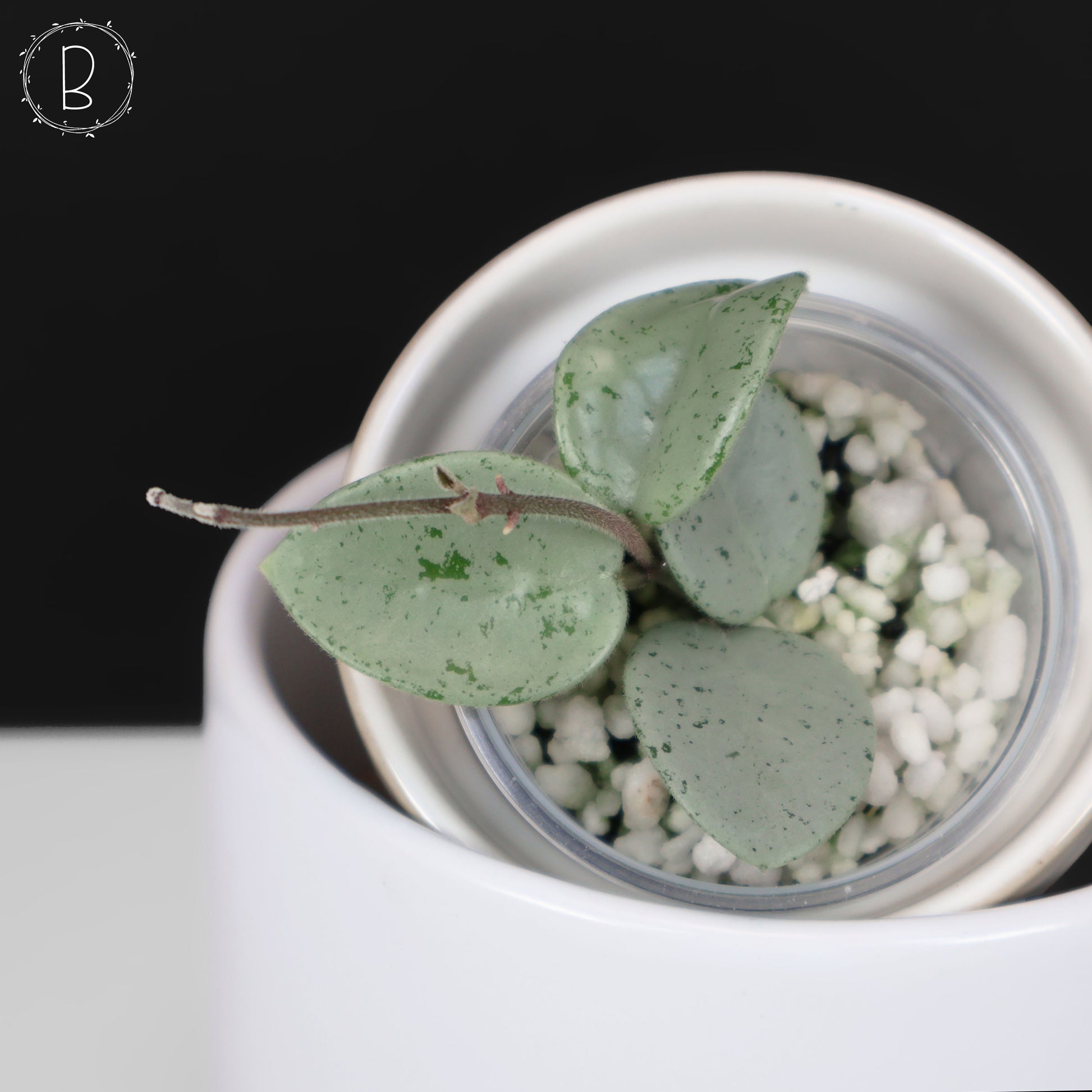 Un híbrido (retrocruzamiento) de Hoya Serpens x Hoya "Mathilde" (Carnosa x Serpens). Presenta hojas pequeñas y redondas con una hermosa variegación plateada y (a veces) toques moteados de verde oscuro. Al exponerse al sol, adquiere un precioso tono púrpura.