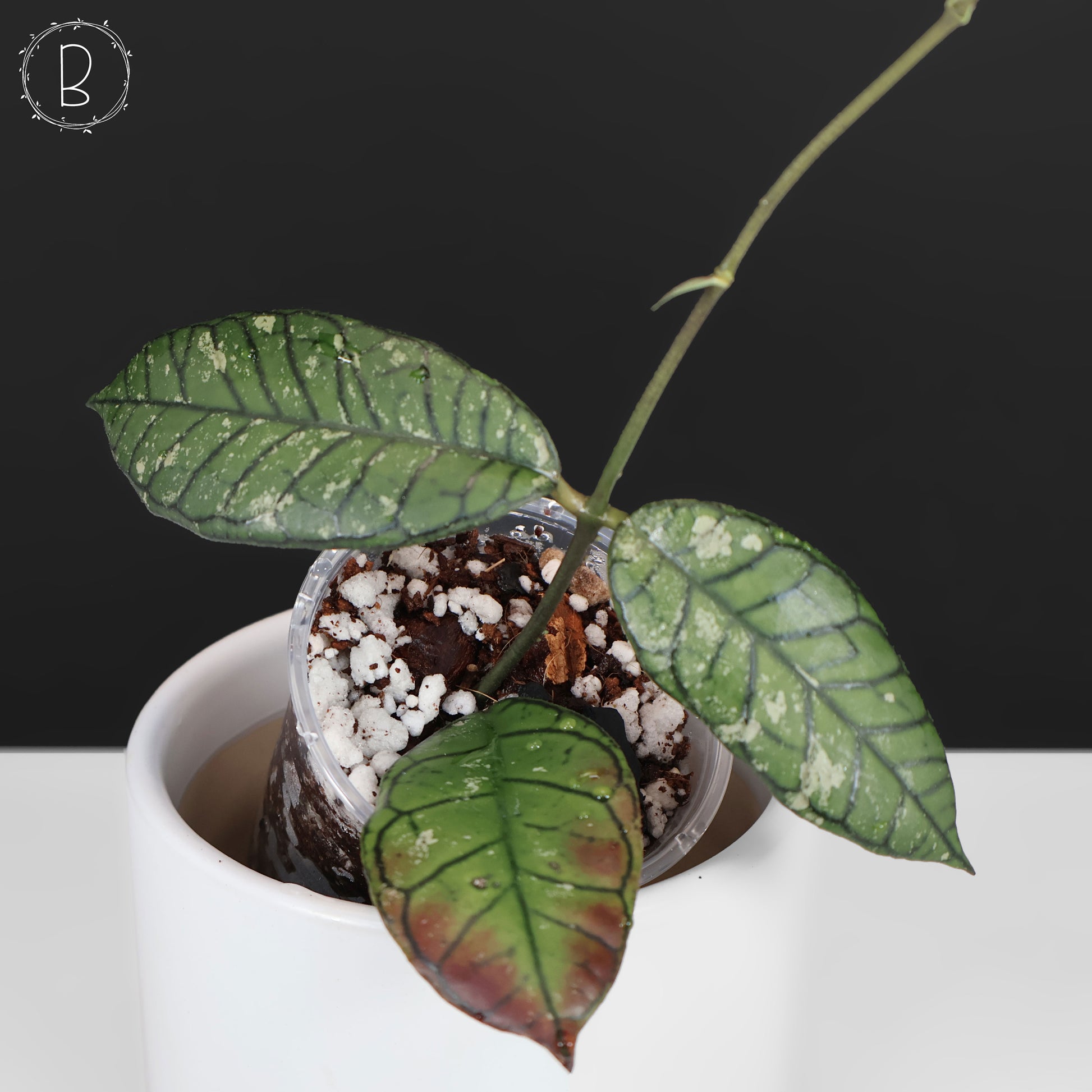 Una variante plateada de la hermosa Hoya Gunung Gading, originaria del Parque Nacional Gunung Gading (de ahí su nombre) en Lundu, Malasia. Pertenece a la familia Finlaysonii y presenta hojas de color verde intenso con nervaduras pronunciadas. Se destaca por su color rojo intenso.