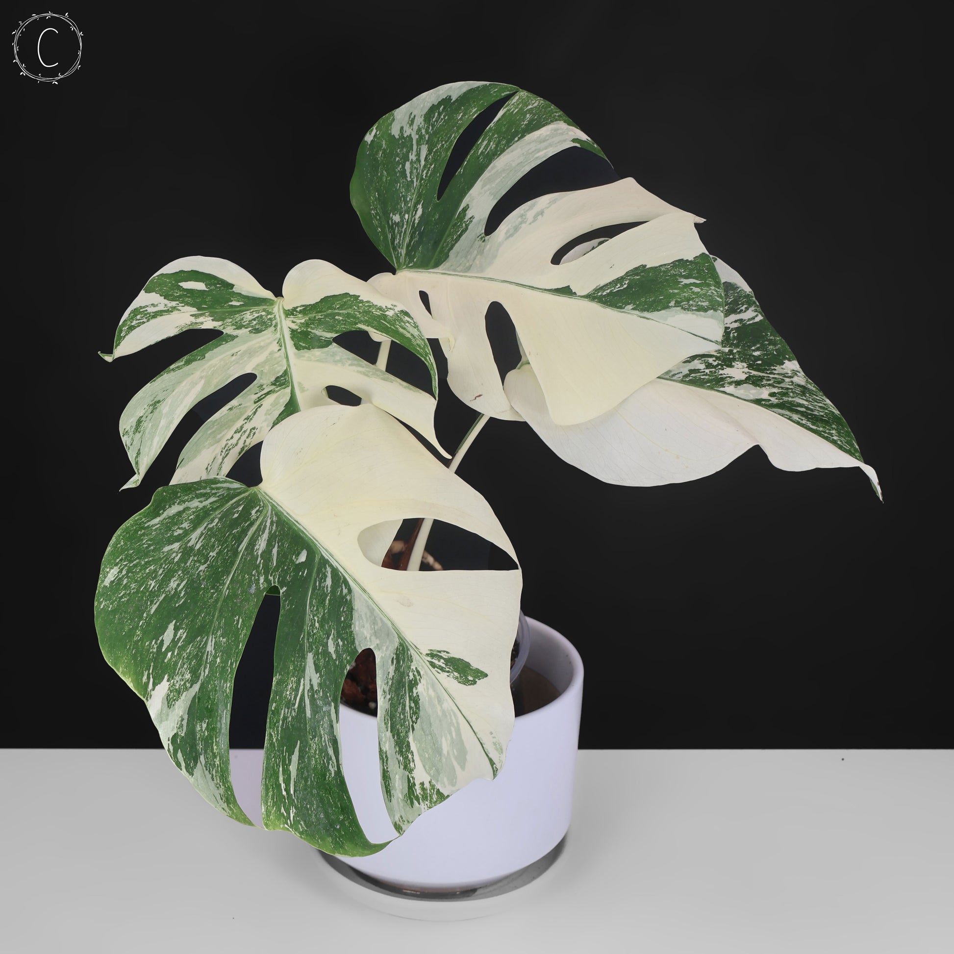 Una variedad absolutamente sorprendente de Monstera Deliciosa (forma pequeña) caracterizada por grandes manchas de color blanco jaspeado.