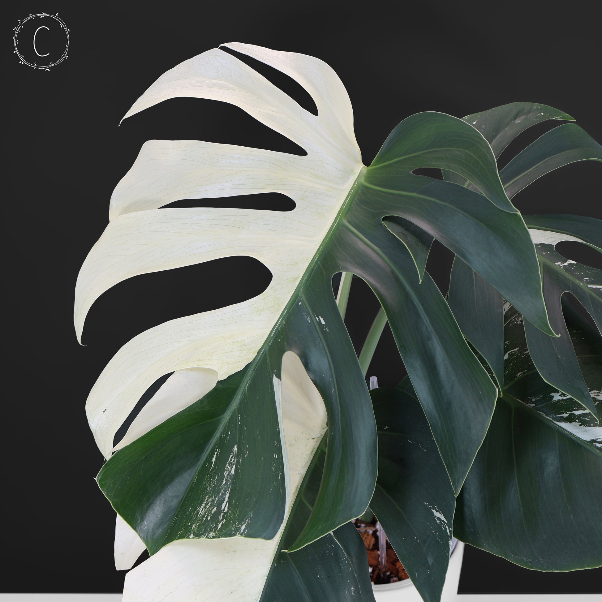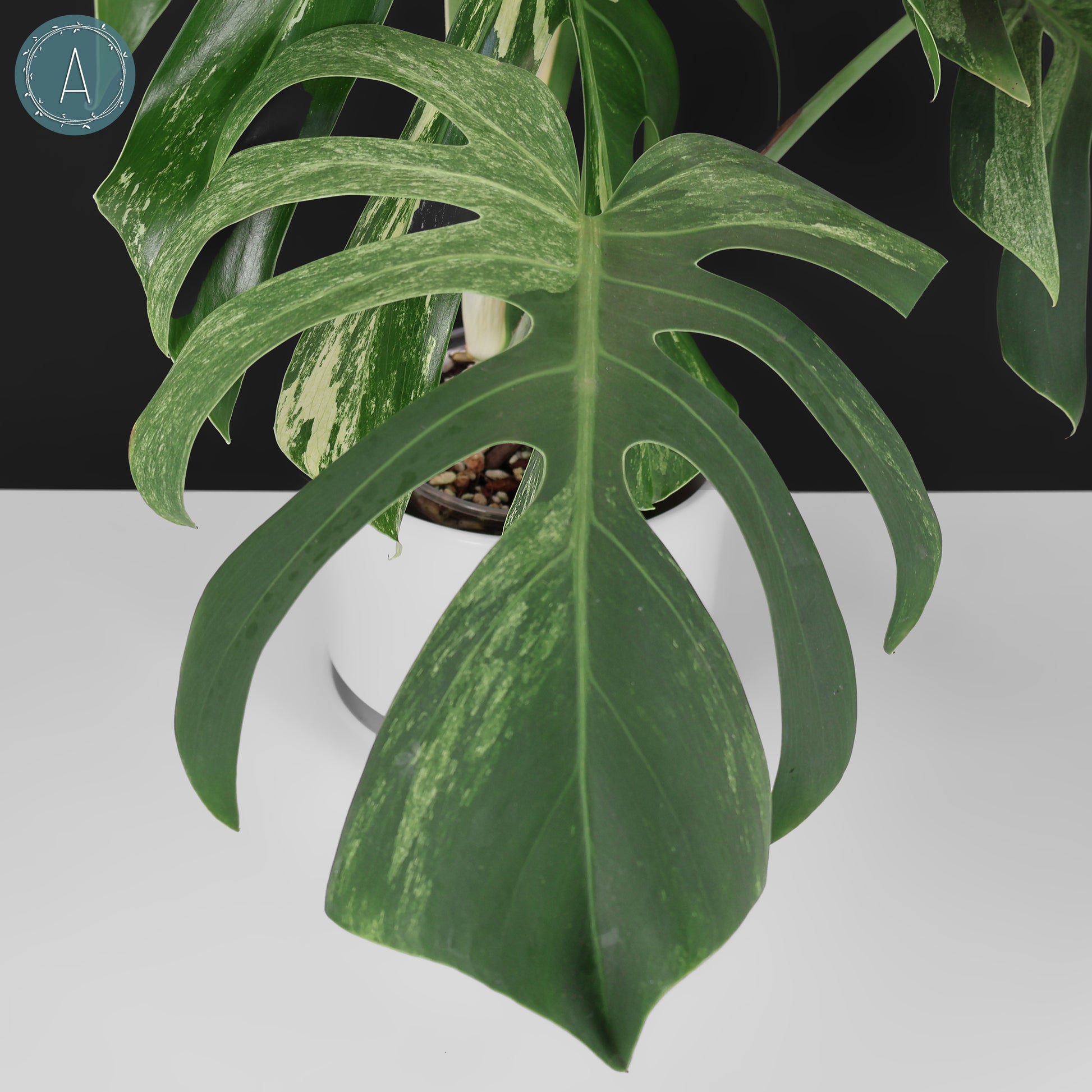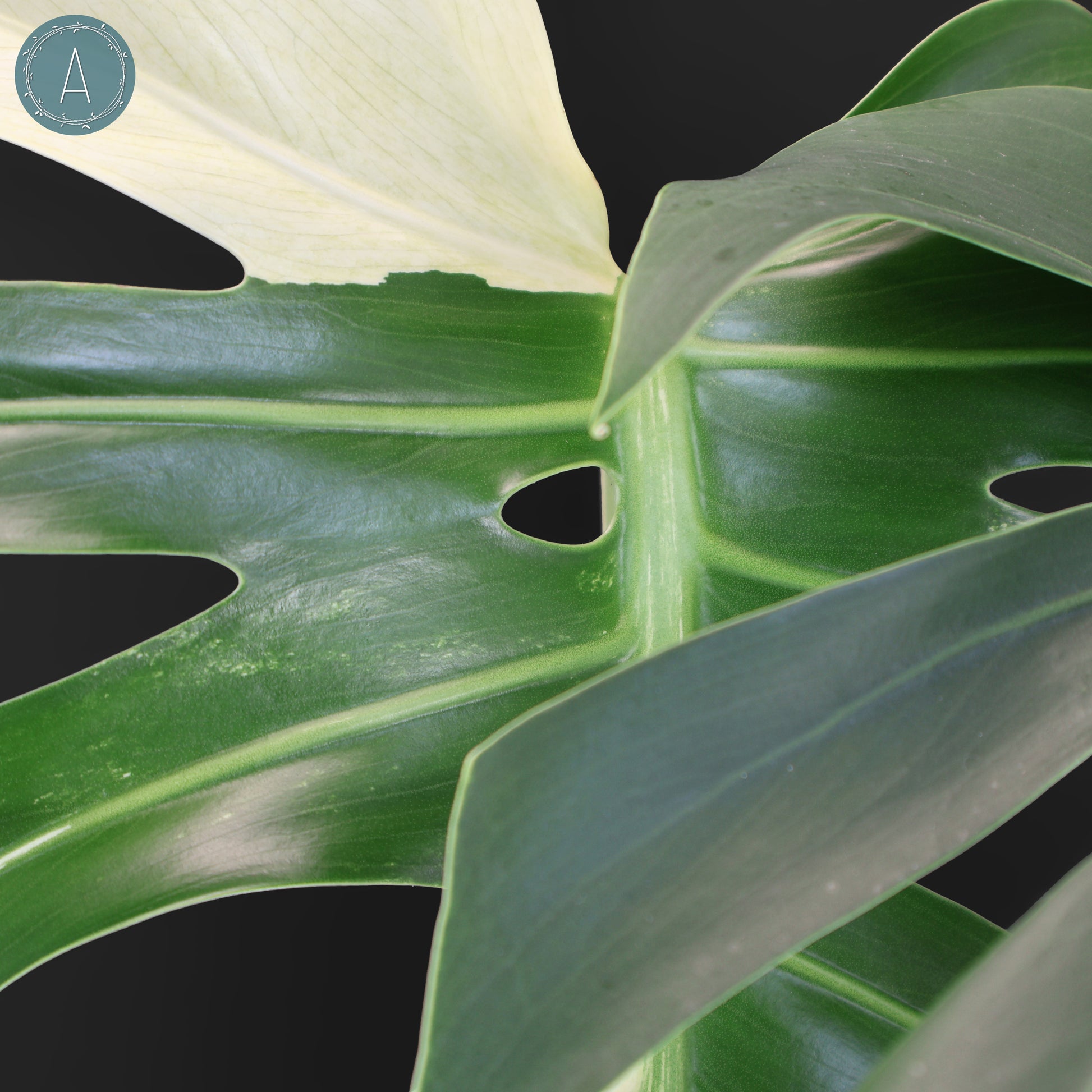 Una variedad absolutamente impresionante de Monstera Deliciosa , caracterizada por grandes manchas de variegación mentolada moteada sobre hojas de color verde intenso. Esta planta es un accesorio de mi madre, la Menta Selva (linaje Barry Schwartz).