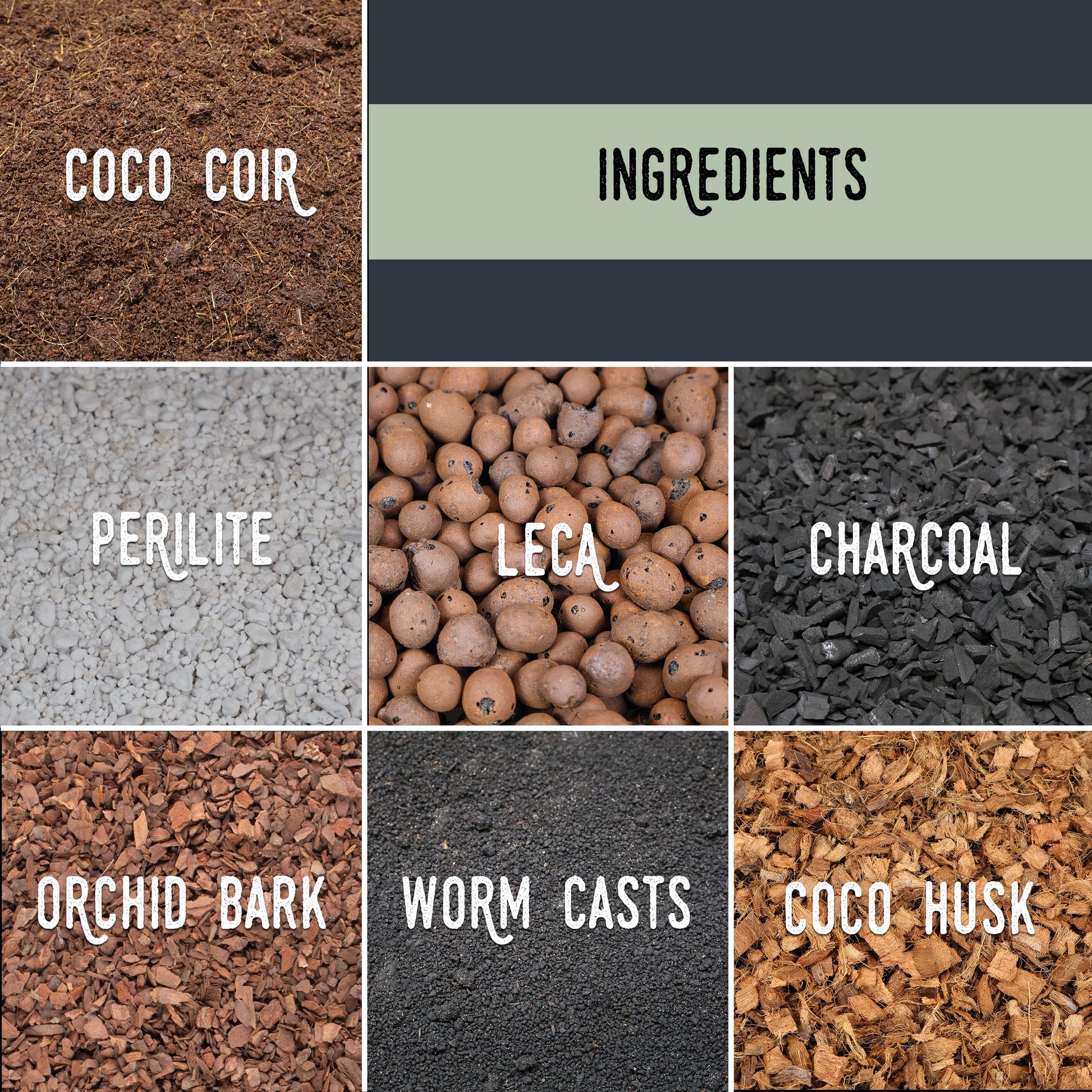May include any of the following - Alfalfa meal, coco coir, coco husk, crab and lobster shell* fertilizer, horticultural charcoal, horticultural sand, kelp meal, lava rock, LECA clay pebbles, orchid bark, perlite, pumice, vermiculite, worm castings and / or zeolite.