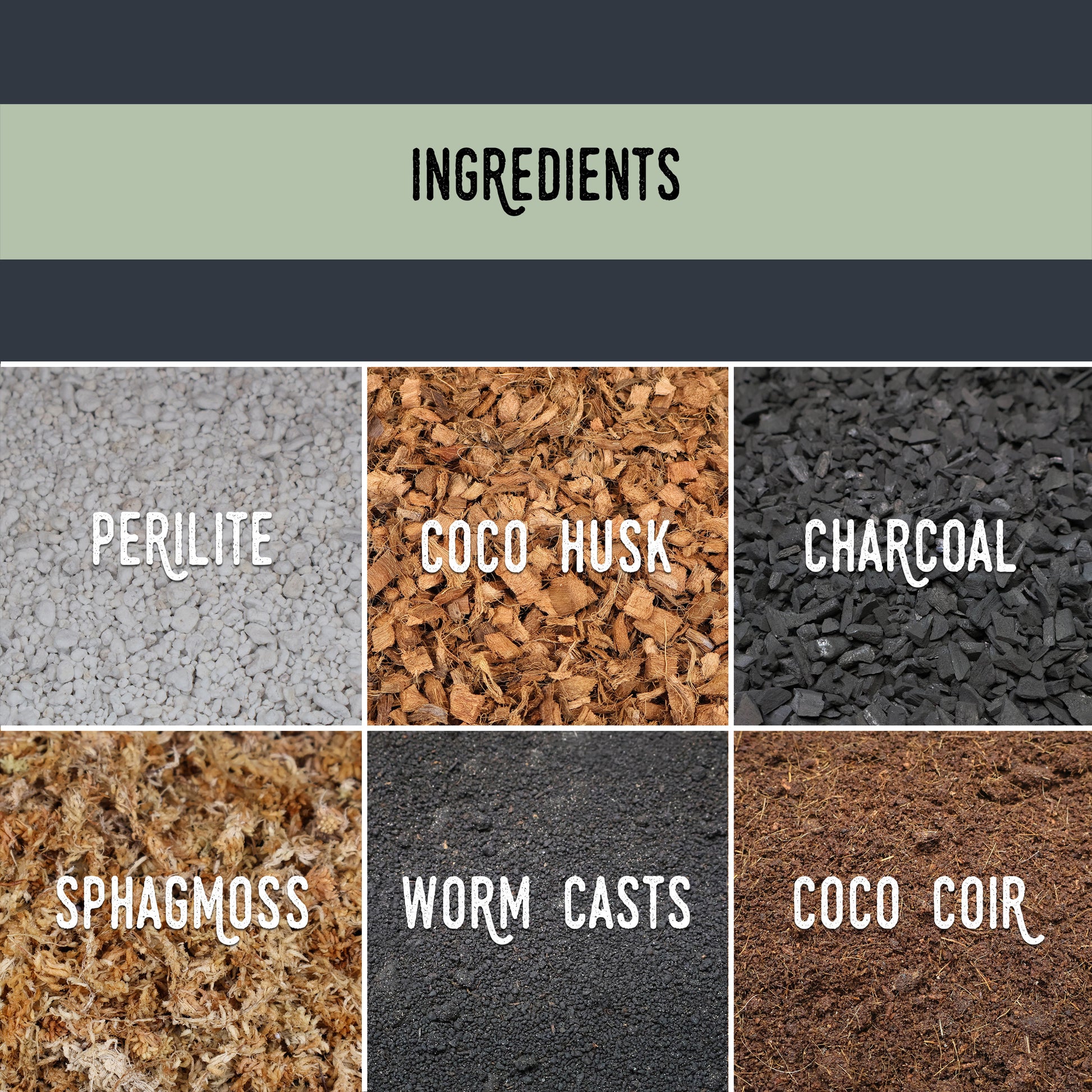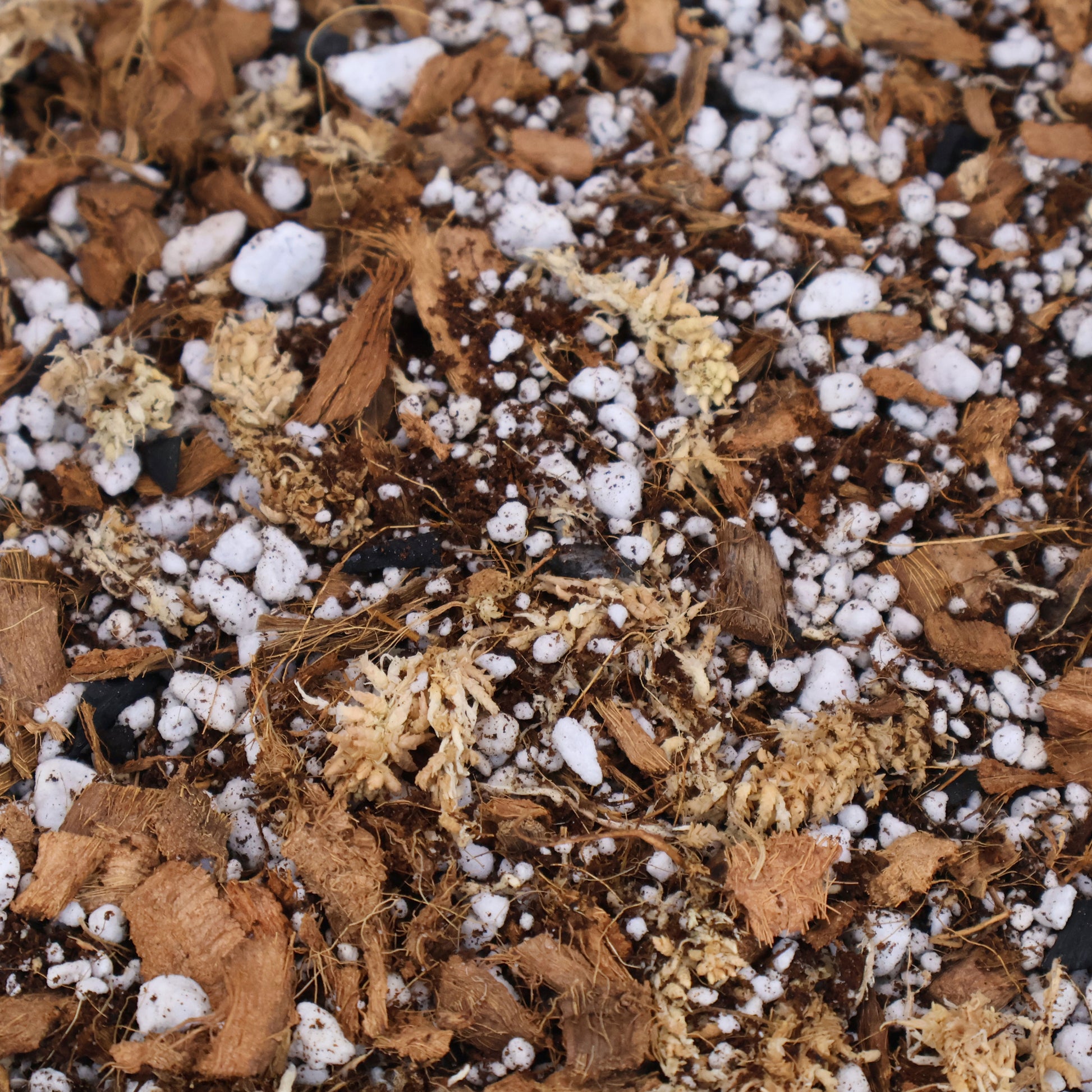 May include any of the following - Alfalfa meal, coco coir, coco husk, crab and lobster shell* fertilizer, horticultural charcoal, horticultural sand, kelp meal, lava rock, LECA clay pebbles, orchid bark, perlite, pumice, vermiculite, worm castings and / or zeolite.