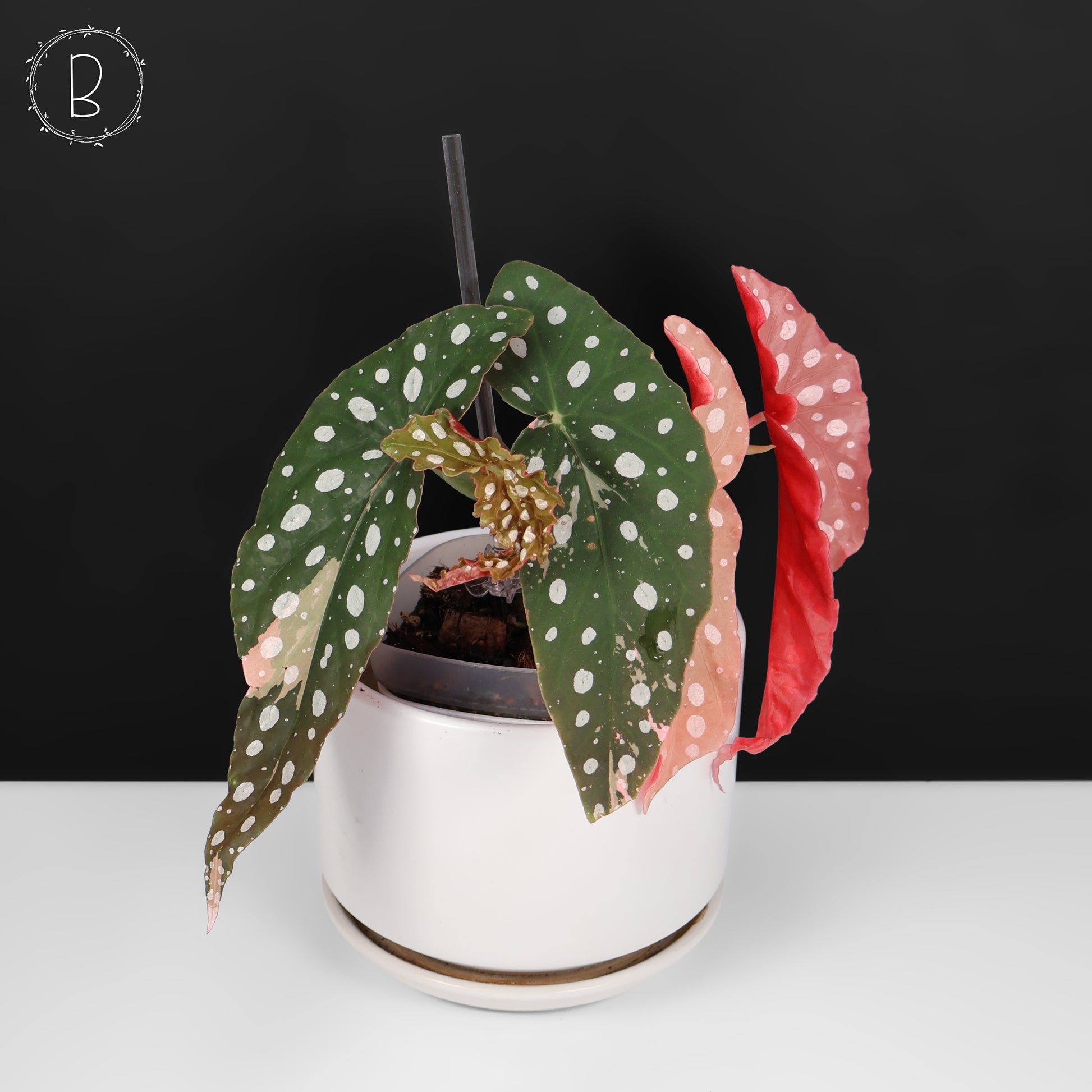 A beautiful, unique Begonia Maculata sport featuring pink variegation (either sectoral or marbled) on deep green polka dotted leaves.