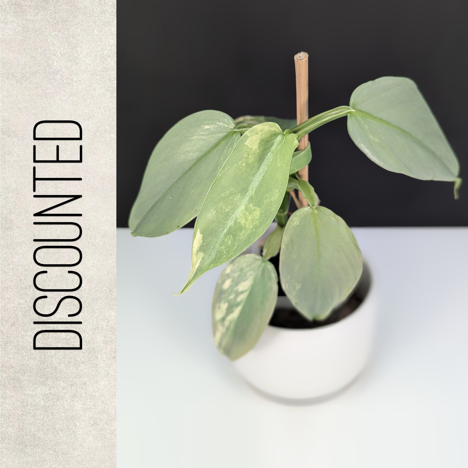 Variegated Philodendron Hastatum (commonly referred to as a Variegated "Silver Sword" Philodendron.) PLEASE NOTE: THIS IS A DISCOUNTED LISTING FOR IMPERFECT PLANTS. They may have some minor mechanical damage, be reverted / reverting, or have been cut. (Plants that have been cut will still have active nodes and will put out new growth.)