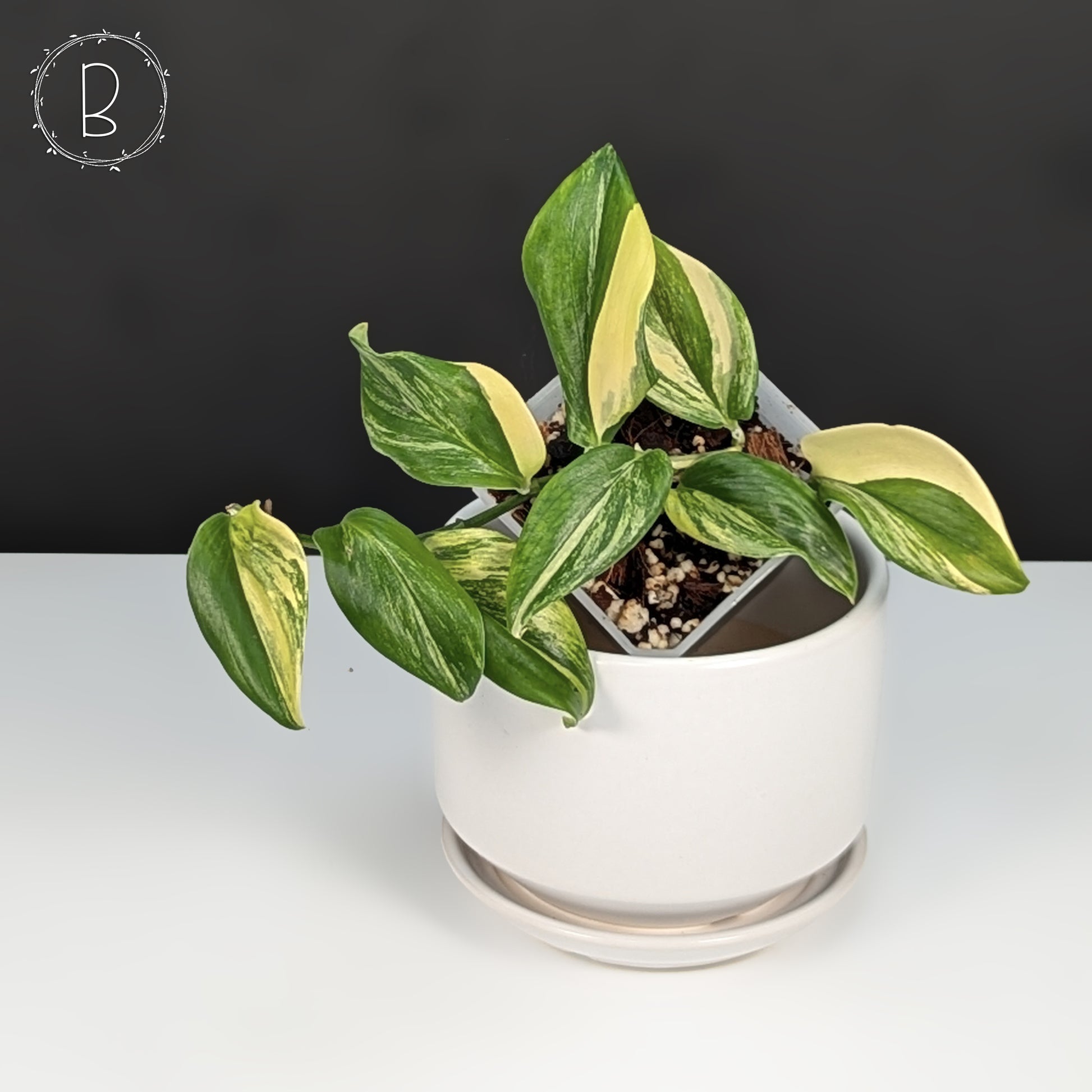 These beautiful Scindapsus display what is sometimes referred to as "polaroid variegation," which comes in yellow and then slowly fades down a creamy white over time.